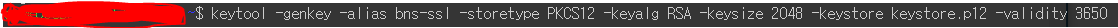 keytool -genkey -alias bns-ssl -storetype PKCS12 -keyalg RSA -keysize 2048 -keystore keystore.p12 -validity 3650